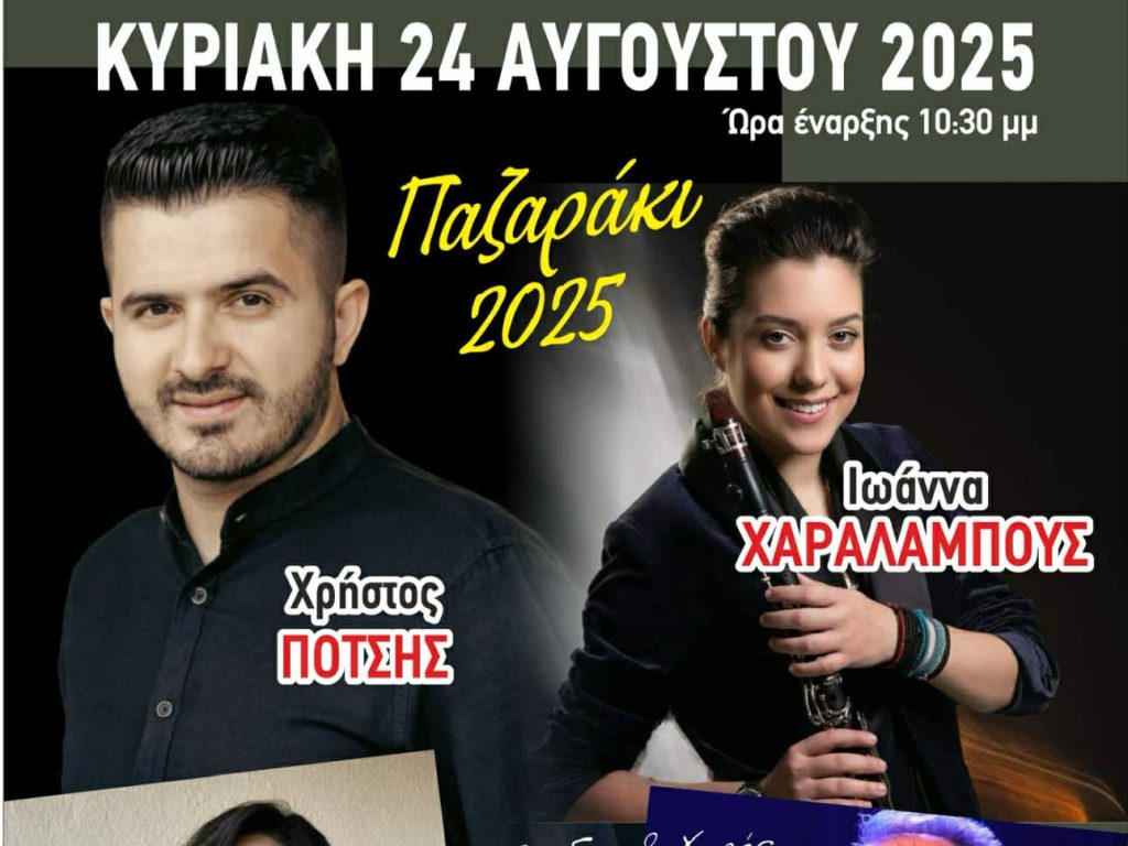 Το Παζαράκι της Φαρκαδόνας ολοκληρώνεται απόψε, Κυριακή 24 Αυγούστου 2025, με μια μοναδική μουσική βραδιά που υπόσχεται να μείνει αξέχαστη σε όσους βρεθούν στην εμποροπανήγυρη.