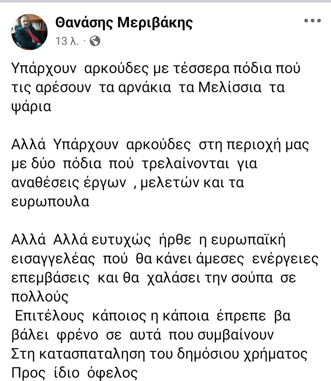 Με μια ανάρτηση που προκαλεί εντύπωση, ο Μεριβάκης επανήλθε στον δημόσιο διάλογο, σχολιάζοντας με μεταφορικό και δηκτικό ύφος φαινόμενα που κατά την άποψη του αφορούν τη διαχείριση του δημόσιου χρήματος.