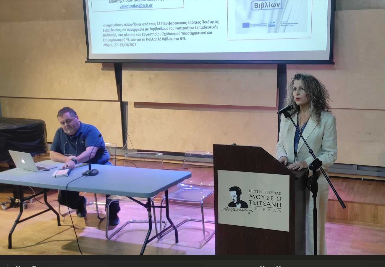 Με μεγάλη επιτυχία πραγματοποιήθηκε σήμερα, 23 Σεπτεμβρίου 2025, η επιμορφωτική δράση με θέμα: «Πολλαπλό βιβλίο: φιλοσοφία, παιδαγωγικό πλαίσιο και διαδικασίες επιλογής», που διοργάνωσαν οι Σύμβουλοι Εκπαίδευσης για τους Διευθυντές/ντριες των σχολικών μονάδων της Πρωτοβάθμιας Εκπαίδευσης Τρικάλων.